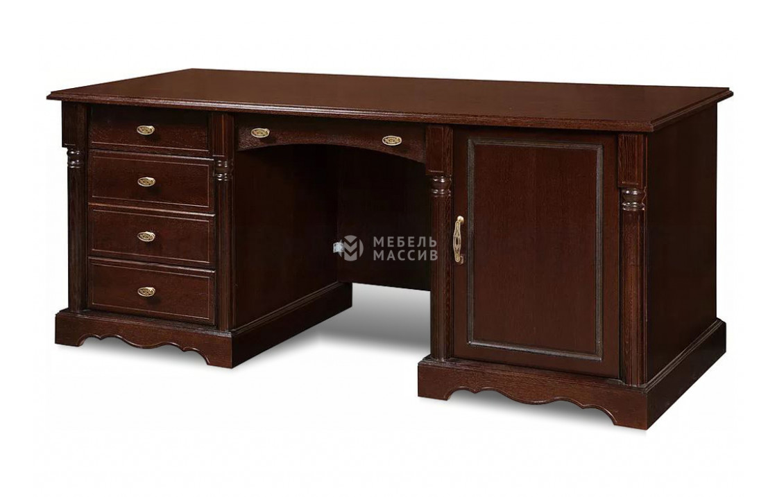 Письменный стол Валео - изделие для размещения в рабочей зоне кабинета или в комнате ребёнка, начавшего посещение школы. Модель имеет огромный функционал, так как обладает высокой посадкой, массивными боковыми стенками, широкой столешницей и обилием выдвижных ящиков и полочек за распашной дверкой для хранения нужного материала. Все подвижные конструкции объединены в удобные тумбы. Изделие позволит комфортно разместиться любому человеку, за прочность отвечает современная фурнитура и материал изготовления в виде сосны. Фасад стола сдержанно украшен резными элементами. Приобрести модель можно в различных цветовых вариантах корпуса, замене подвергаются и ручки. Доставка по Белгороду и Белгородской области.| Размер | Цена | |