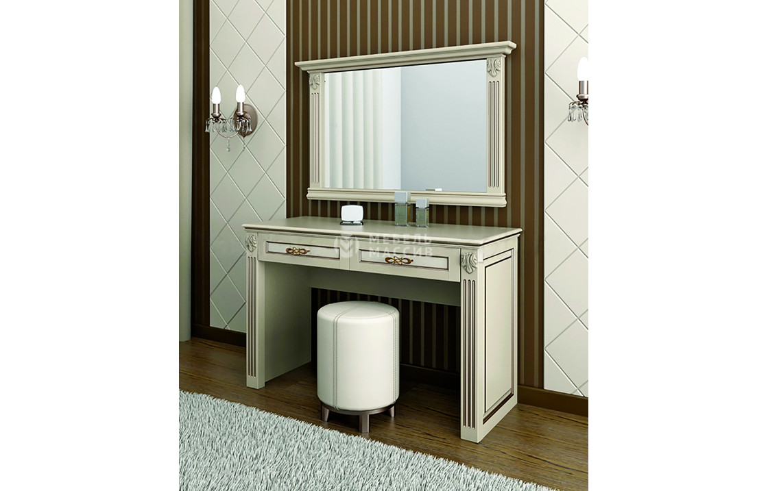 Амелия - прекрасное дополнение в меблировке спальной комнаты, выполненное в одном стилевом направлении и способное сделать окружающий антураж более уютным и стильным. В комплект входят: удобный, высокий столик с двумя выдвижными ящиками на направляющих и большое зеркало с хорошим обзором. Каждый элемент изготовлен из экологичного и прочного материала, поэтому длительная эксплуатация мебели обеспечена. Дизайн простой, без лишнего или броского декора. Зеркало помещается на нужной высоте, его оправа также повторяет декор столика. Зеркало зрительно расширяет пространство комнаты и улучшает ее освещение. Цвет комплекта выбирается индивидуально.| Размер | Цена | |